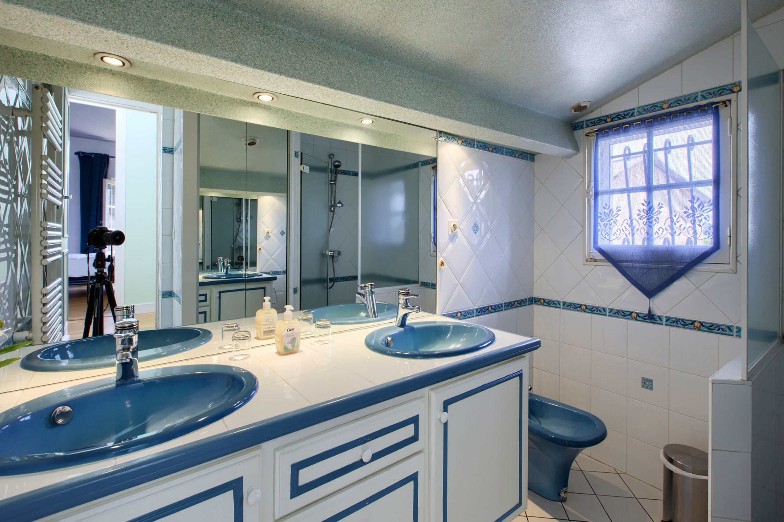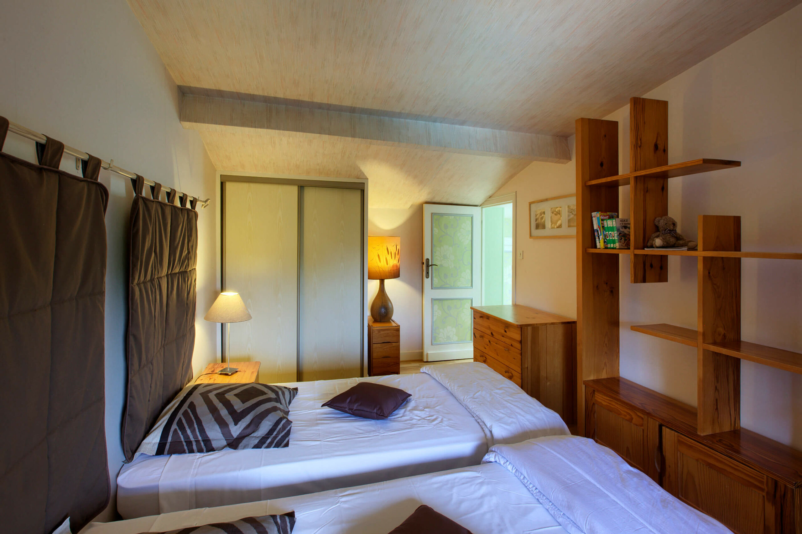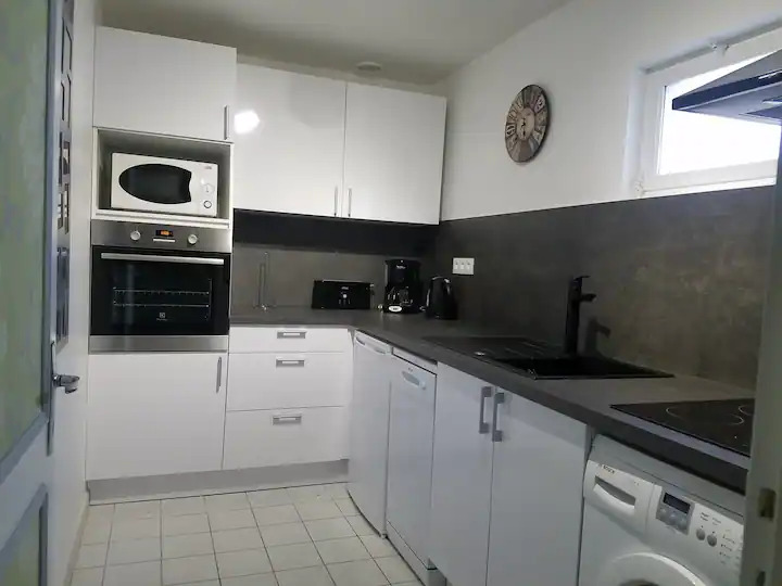 Entièrement équipée, elle comprend deux chambres (un lit double et deux lits simple), une salle de bain, deux WC, un salon avec couchage d’appoint, et une cuisine complète (lave-vaisselle, four, micro-ondes, machine à laver…).